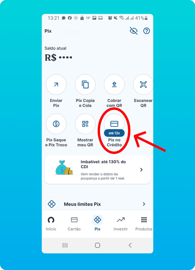 Abra seu aplicativo do Inter e selecione a opção "PIX no Crédito".